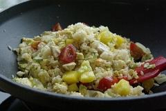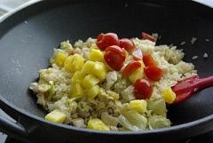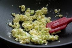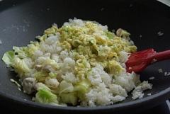 고슬하게 지은 밥과 스크램블에그를 넣고 골고루 볶아준다