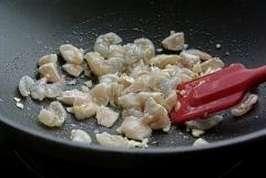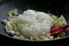 마늘이 볶아지면 닭살과 새우살을 넣고 볶아 준 다음 양배추를 넣고 볶는다