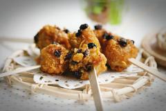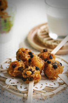 바나나 튀김볼: 바나나 2개, 소금, 올리고당, 콘후라이트 2컵, 건포도 약간