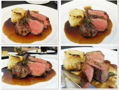 감자 그라땅과 레드 와인-마데이라 소스를 곁들인 훈제하여 구운 미국산 뉴욕 스테이크