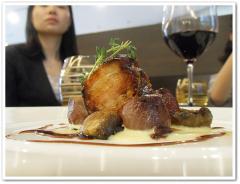 Braised U.S. Pork Belly with small onions, Mustard Cream and Red Wine Reduction