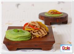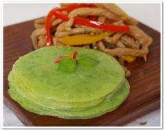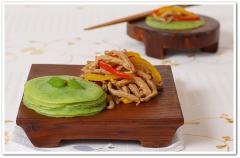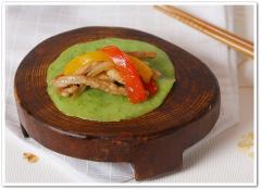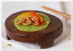 매콤한 고추를 갈아 만든 전 위에 고추잡채(피망잡채)를 올려