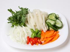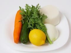 쑥갓한줌,무100g 당근1/4개,양파1/6개,오이1/2개,레몬1/4개,청,홍고추1개씩