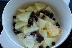 사과조림 : 사과 100g, 설탕 1큰술, 버터 1큰술, 계피가루 1/2작은술, 건포도 10g