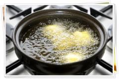 기름 온도가 올라가면 튀김옷입은 바나나를 넣어 튀겨줍니다.