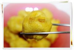 튀김가루에 치자물을 넣어 튀김옷을 만들었습니다.