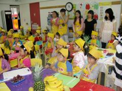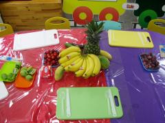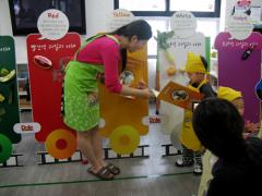 컵에 5가지 과일을 다 담겨져 있는지 요리 선생님과 5가지 색깔 과일을 확인하고있어요.