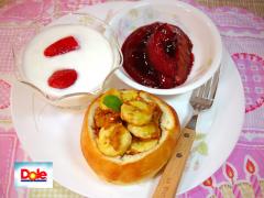 요구르트에 딸기 몇 개 넣고.. 배조림과 바나나빵컵구이로 아침식사를 했답니다.