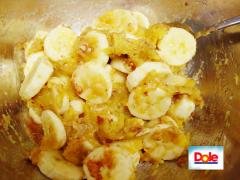 으깬 고구마에 바나나 3개를 동그랗게 썰어넣고.. 다진 피칸과 꿀, 계피가루를 넣어 잘 섞어줍니다.