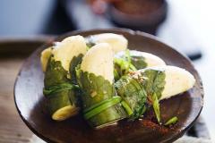 ② 끓여 오르면 불을 끄고 깻잎, 바나나를 넣고 그대로 식혀낸다. 깻잎으로 바나나를 싸고 미나리로 묶어내며 된다.