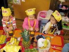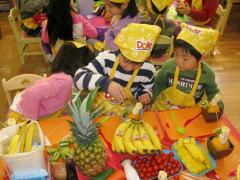 오렌지 화분에 5가지 과일을 꽂는 우리 친구..