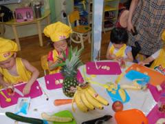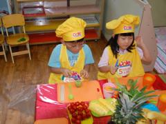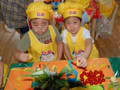 두번째 요리~~5가지 과일과 채소를 찾아 쏙쏙 담는 우리 친구들 대단 해요.