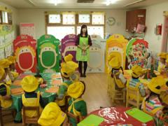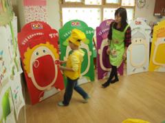 각 색깔 칠판에 같은 색깔 과일 채소를 입에 쏙쏙 붙여 주고 있어요.
