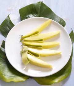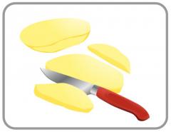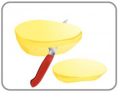 2. 씨의 위 아랫부분을 평평하게 잘라내면 망고는 3장으로 나뉜다.