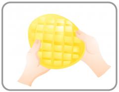 1. 씨를 중심으로 상하로 잘라 3장으로 만든 망고의 과육에 사선으로 체크모양의 칼집을 그어준다.