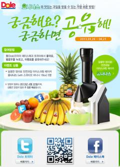 본 온라인 이벤트는 오는 4월 21일까지 진행되며, 돌(Dole)코리아 페이스북 및 트위터에서 좋아요 또는 팔로우를 누른 후, 이벤트 페이지를 공유하면 참여 가능합니다.